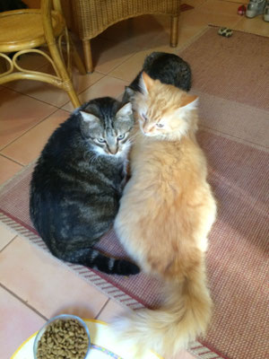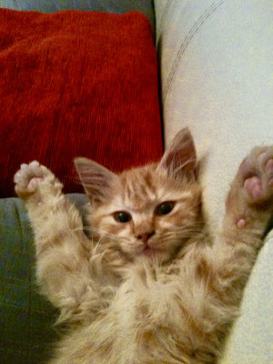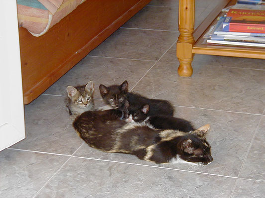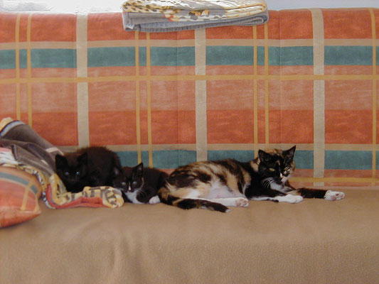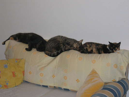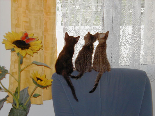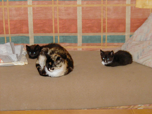 regelmäßig drinnen. Sie wurden langsam größer und noch lebhafter. Wenn wir abends fernsehen guckten, breiteten sich alle drei auf der von uns gegenüber stehenden Couch aus und tobten darauf