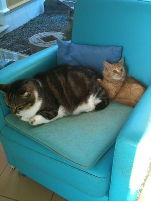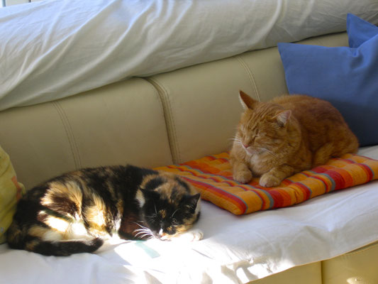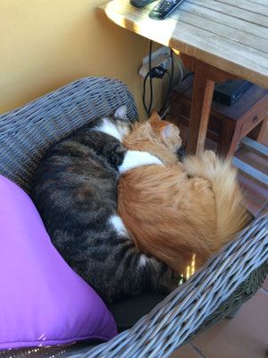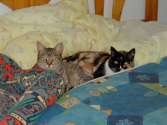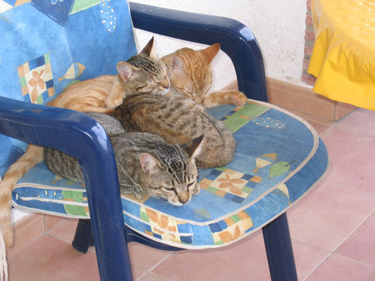 dreifarbigen, die man übrigens Glückskatzen nennt, und immer weiblich sind, (dieses erfuhr ich aber erst später) zusammen gekuschelt auf einem Stuhl. Die weiße lag alleine auf einem anderen