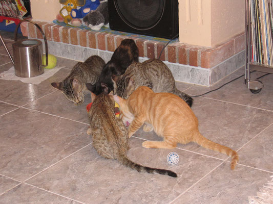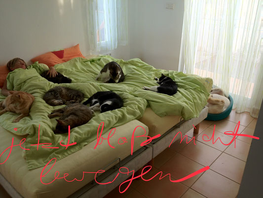 eine Horde Katzen, die alle sehr scheu waren und Hunde noch nicht kannten, die meisten jedenfalls nicht. Ich also Marie-Luise angerufen. Nicht zu Hause. Elke angerufen. Auch nicht zu Hause. Beide