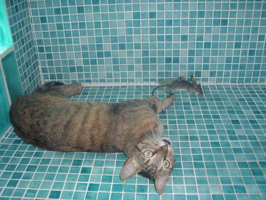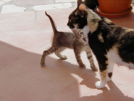 pummelig und wollte die Schwangerschaft nicht wahr haben. Bis ich am 11. April 2003 zwei ganz kleine neue Kätzchen auf dem hinteren Poolrand entdeckte. Wieder fast an der gleichen Stelle, wo
