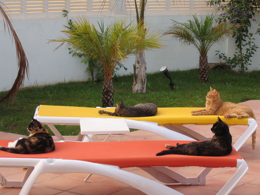 Und jetzt zu den drei neuen Katzen, weshalb Miss Elly wahrscheinlich gegangen ist. Diese drei waren allerdings nur der Anfang. Sie saßen wie die Orgelpfeifen am hinteren Poolrand. Weil sie