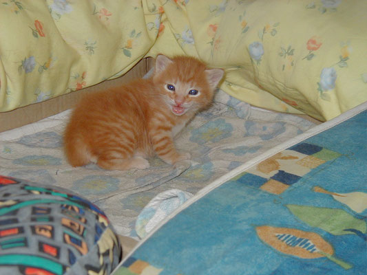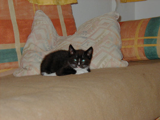 wieder auf die Straße schicken konnte. Ich mußte mich also damit abfinden, daß ich jetzt doch wieder acht Katzen hatte. Er war höchstens acht Wochen alt. Ich konnte ihn sofort auf den Arm nehmen.