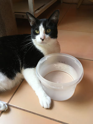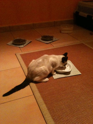 als würde er sich im Haus schon auskennen. Das Trockenfutter fraß er zwar gerne, aber den Thunfisch mochte er noch lieber. Am allerliebsten den von den anderen Katzen. Wenn sein Teller leer war,