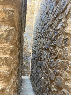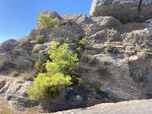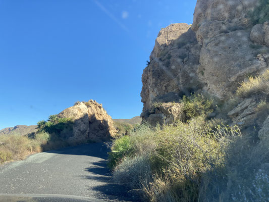 links eine Felswand mit nach unten unregelmäßig vorstehenden Felsbrocken, die leicht, aber genug für eine schmale, kurvige Straße, auf die verbliebene Fahrbahn ragten. Wir schlichen uns eine
