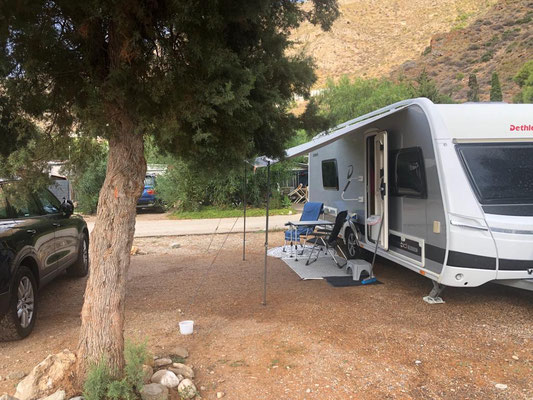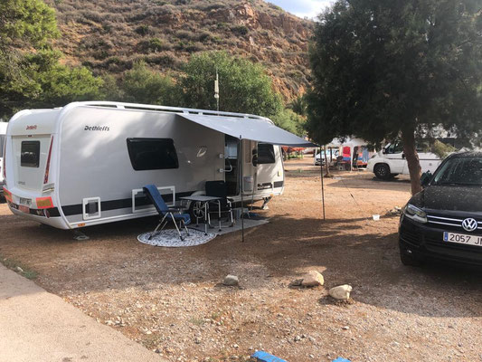 Am 18. September 2020 starteten wir unsere eigentlich 1. und richtige Reise mit unserem neu erworbenen Wohnwagen „Dethleff“. Da sich das Coronavirus immer noch überall rumtrieb und es in allen Ländern wieder schlechter geworden ist, hielten wir es für besser, im Land zu bleiben. Sonst wären wir gerne nach Frankreich gefahren. Also hatten wir uns einen Campingplatz in der Nähe von Cartagena ausgesucht. Dieser hatte im Internet und in den Campingführern sehr gute Beurteilungen. Eine wunderschöne Lage an einer kleinen Bucht, ringsum von Bergen umgeben, und, was für uns wichtig war: jeder Stellplatz mit Strom- und Wasseranschluß. Außerdem weitgehend naturbelassen.
