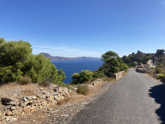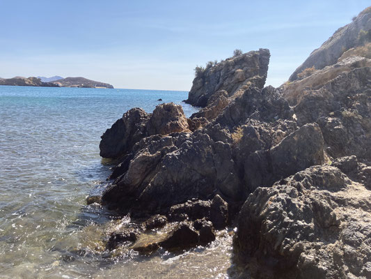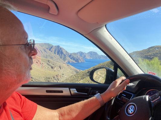 dorthin. Die Straße führte zu Anfang direkt an verschiedenen, wunderschönen Badebuchten, mit kristallklarem Wasser, vorbei. Danach ging es durch eine sehr schöne Berglandschaft, teils karg und