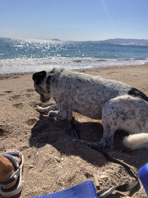kam er zu mir und schüttelte sich. Wo denn auch sonst. Aber er entdeckte auch, dass man im Sand nicht nur gut rennen kann, sondern auch gut Löcher buddeln kann. Und zwar seeehr tiefe. Den